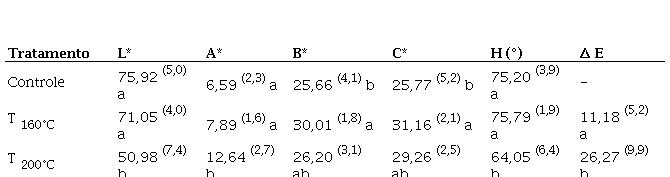 Os parâmetros cromáticos azul-amarelo (b*) indica aonde a redução dos valores relacionados a essa variável de degradação da lignina e dos extrativos, os quais associam-se diretamente com os cromóforos responsáveis por conferir a madeira uma tonalidade mais clara Pincelli et al. (2012), justificando assim a tonalidade mais escura das madeiras com tratamento térmico nas duas faixas de temperaturas mais intensas (200 °C e 240 °C).