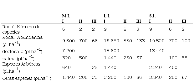 En Tabla 3 se presenta información de la biodiversidad para las zonas de estudio de la plantación, detallada según categorías de tamaño de la regeneración natural. Entre las especies comunes a las tres zonas se destaca “doctorcito”, única especie herbácea perenne que tiene presencia en el sotobosque de manera regular, demostrando su gran capacidad de colonización y de adaptación a diversos niveles de “sombreamiento” y competencia; y la “palma, caranday”, colonizadora de tallo leñoso, abundante y frecuente en toda la Zona Este, húmeda de la provincia de Formosa.