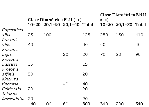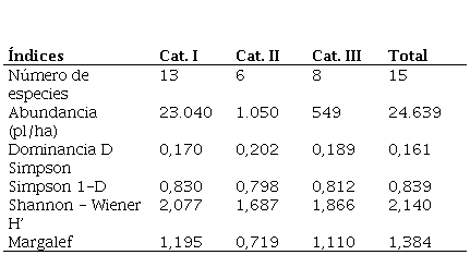 En la Tabla 6 se presentan los resultados de los índices de biodiversidad alfa determinados para la regeneración natural de plantas perennes del bosque nativo, detallados en las tres categorías de tamaño. La mayor riqueza y abundancia específica se registra en la Categoría I, que agrupa a las especies cuyas bioformas encuentran correspondencia con las dimensiones establecidas para esta categoría y a las plantas reclutas del sistema, es decir ejemplares pequeños de especies arbustivas, arbóreas o con tallo leñoso. El 52,1 % (12.000 pl.ha-1) del total de individuos de la Categoría I está conformado por plantas de las especies doctorcito y palma caranday. El porcentaje restante se distribuyen en 11 especies, entre las cuales sobresalen por abundancia la escoba negra, molle y tala. En las Categorías II y III se destacan algarrobos, palma y tala. Estas tres especies más mora y molle son las cinco que tienen presencia en las tres clases de tamaños de regeneración.