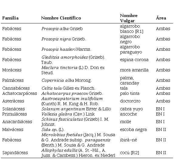 - Respecto de la riqueza específica se reconocieron en total quince especies perennes, la mayoría leñosas, registrándose seis especies comunes a las tres zonas (Prosopis nigra, Maclura tinctoria, Copernicia alba, Celtis tala, Achatocarpus praecox . Austroeupatorium inulifolium). Los valores calculados para los índices de Margalef (<1,3) y Shannon-Wiener (<1,4) refieren en todos los casos que la regeneración natural de las zonas estudiadas presenta baja diversidad, y según el índice de Simpson (<0,6) no hay dominancia de ninguna especie.