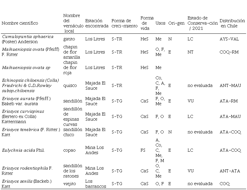 Los usos de las cactáceas encontradas en la quebrada El Coipo y sus alrededores se representan en la Tabla 3. En relación a las entrevistas aplicadas a los algunos lugareños se reconocieron 10 especies cactáceas.