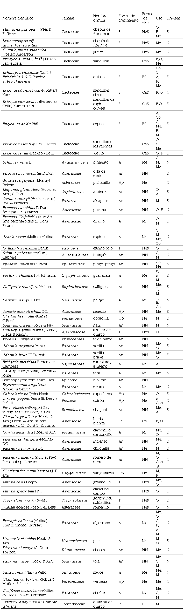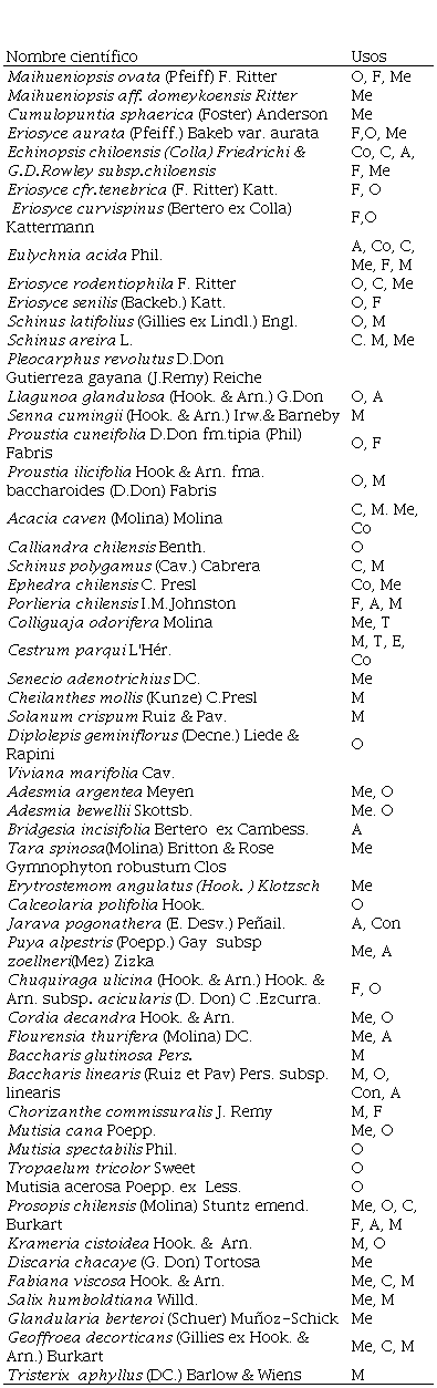 Además de las Cactáceas, en la Quebrada El Coipo, la comunidad utiliza casi todas las plantas vasculares que existen a su alrededor, en la Tabla 3, se muestran estos usos: A = alimenticia, C = combustible, Me = medicinal, F = forrajera, O = ornamental, M = melífera, T = tóxica