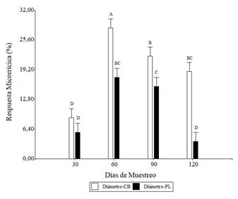 A partir de los 30 días ambos inóculos mostraron una capacidad similar para mejorar el crecimiento de N. alba con una RM positiva en el diámetro, sin embargo, a partir de los 120 días de tratamiento la Respuesta Micorrícica (RM) mostró un comportamiento diferente según los inóculos probados (Figura 1). El inóculo de CB aumentó significativamente la RM para el diámetro en contraste con las plantas inoculadas con PL, donde la RM para el diámetro fue marcadamente menor y se redujo drásticamente a los 120 días de tratamiento en condiciones normales de riego (Figura 1).