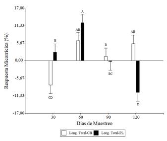 La evaluación de la longitud total de las plantas mostró a los 30 días una respuesta negativa para las plantas inoculadas con CB, pero la RM se incrementó desde los 60 días, manteniéndose positiva hasta el final del ensayo. Por el contrario, las plántulas inoculadas con PL evidenciaron una respuesta positiva en longitud total a los 30 y 60 días, alcanzando el máximo valor a los 60 días. Luego, a los 90 días la respuesta fue prácticamente nula y a los 120 días negativa (Figura 2).