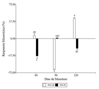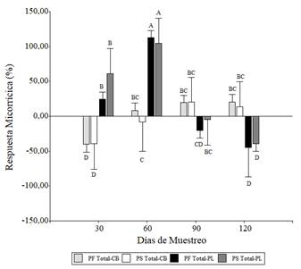 Las RM del peso fresco (PF) y peso seco (PS) total de las plántulas a la micorrización con CB fueron negativas a los 30 días. A partir de los 60 días, las RM fueron en general positivas hasta los 120 días. Lo contrario ocurrió con las plántulas con el inóculo de PL que presentaron desde los 30 días una respuesta positiva, a los 60 días los porcentajes alcanzaron los mayores valores disminuyendo hasta obtener respuestas negativas a los 120 días. Las respuestas en PF Total y PS Total a los 90 días para las plantas inoculadas con CB y PL no fueron estadísticamente significativas, sin embargo, se observó que la RM fue positiva para CB y negativa para PL (Figura 3).