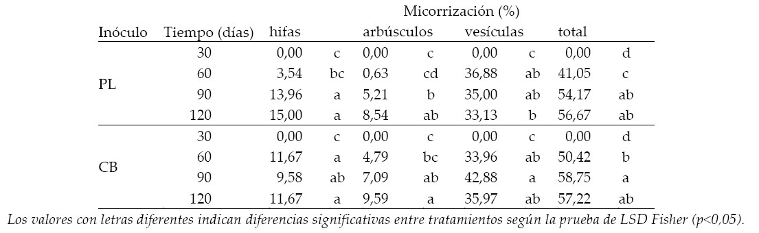 Al cuantificar la capacidad de micorrización de N. alba con ambos inóculos, se observó que, a los 30 días, las plántulas muestreadas no presentaron las estructuras características de la micorrización de los HMA, probablemente a consecuencia del corto tiempo de exposición de las raíces de las plantas a los HMA. Sin embargo, a partir de los 60 días se registró la aparición de estructuras características, donde el porcentaje total de micorrización fue mayor para el inóculo proveniente de CB. A los 90 días de tratamiento, el porcentaje total de micorrización alcanzó su mayor aumento, el cual fue similar en ambos inóculos, manteniéndose constante hasta los 120 días (Tabla 1). Particularmente, las plantas inoculadas con CB presentaron una temprana formación de hifas, desde los 60 días y hasta los 120 días, mientras que el inóculo de PL mostró un incremento en las hifas recién a partir de los 90 días (Tabla 1).