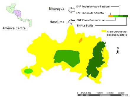 El área de estudio cubre una extensión de 160.203 ha y se localiza en los departamentos de Choluteca en Honduras y los departamentos de Madriz y Chinandega en Nicaragua comprendiendo la jurisdicción de 16 municipios (véase Figura 1). En el territorio se encuentran emplazados los espacios naturales protegidos de Tepesomoto - La Patasta y el Cañón de Somoto en Nicaragua, y La Botija y el cerro Guanacaure en Honduras. Los ecosistemas presentes en el territorio de estudio son muy diversos y están constituidos por bosque nuboso, bosque seco, pinares y robledales y la combinación de éstos, áreas agropecuarias, sistemas agroforestales, formaciones arbustivas y sistemas riparios.