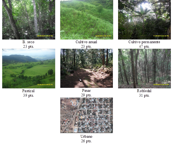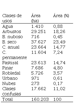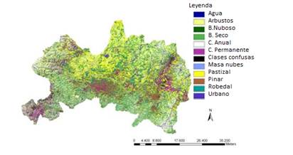 Las clases de usos del suelo a separar en el proceso de clasificación fueron establecidas previamente a la fase de campo, estas clases son: agua, arbustos, bosque nuboso, bosque seco, cultivo anual, cultivo permanente, pastizal, pinar, robledal y urbano (véase Figura 2).