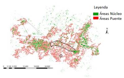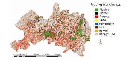 El análisis espacial de patrones morfológicos muestra que las formaciones de bosque representan el 39,54 % del territorio estudiado equivalente a 63.358 ha, de las cuales el 34,79 % están clasificadas como áreas Puente. Esta situación refleja el alto nivel de fragmentación del paisaje, aunque la presencia de éstos últimos podría ser una condición básica para lograr la conectividad de los principales componentes identificados.