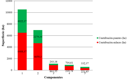 La Figura 4 refleja que el área de bosque está dominada por la clase Puente, elemento responsable de la conexión entre zonas Núcleo. Esta clase representa el 34,79 % del área total de bosque con una superficie de 22.042 ha. La clase que ocupa el segundo lugar en superficie es la clase Ramal con 12.298 ha (19,41 %), seguidamente aparecen las clases Núcleo y Borde con 8.914 ha (14,07 %) y 8.870 ha (14 %) respectivamente; con una superficie similar se encuentra la clase Isla con 8.756 ha (13,82 %). Por último, se encuentran las clases Lazo (3,31 %) y Perforación (0,6 %). Se identificó un total de 946 componentes con tamaños que oscilan entre 0,09 ha y 10.510,74 ha. Los componentes de menor tamaño (0,09 ha) dominan el paisaje y se encuentran en una proporción del 30,65 % seguidos por componentes de 0,18 ha y 0,27 ha que representan el 13,10 % y 4,75 %. El resto de componentes se encuentran con menor frecuencia lo que significa que su tamaño es inversamente proporcional a su frecuencia de ocupación del territorio. Luego fueron identificados los cinco mayores componentes del territorio destacando que la identificación de éstos se realiza tomando como parámetro el tamaño de la clase Núcleo de cada componente. Los dos mayores componentes afectan los espacios naturales protegidos Tepesomoto - La Patasta y La Botija, los otros tres componentes no están bajo ninguna figura de conservación (véase Figura 4). El espacio protegido Cerro Guanacaure con una extensión de 1.976,57 ha constituye en términos generales uno de los componentes de mayor tamaño, sin embargo, no se incluye dentro de los cinco más importantes por su magnitud debido a que su estructura está constituida en un 92,36 % por la clase Puente y solo un 7,64 % pertenece a la clase Núcleo, lo que sugiere que el nivel de fragmentación al que ha sido sometida dicha área es intenso.
