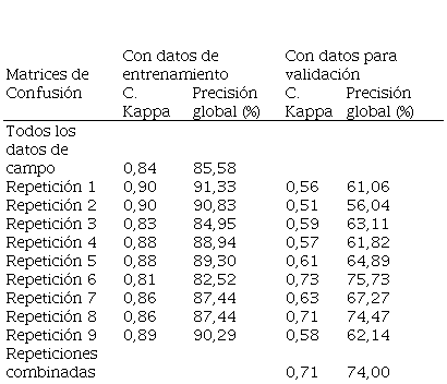 El hecho de que los valores Kappa y los niveles de precisión global sean inferiores cuando los modelos son desarrollados únicamente con los datos de validación podría deberse al bajo número de muestras y la variabilidad numérica entre las distintas clases. De acuerdo a Cachorro et al. (2001), la precisión y otros parámetros estadísticos del método de clasificación máxima verosimilitud puede verse afectado si el número de muestras disponibles es relativamente bajo.