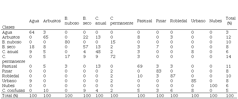 En el caso de algunas clases la confusión podría explicarse porque los objetos que las representan contienen ciertas similitudes en su estructura física, por ejemplo: las clases Bosque Nuboso y Cultivo Permanente presentan semejanzas en sus características estructurales y composición florística mayor, lo que se debe a que la segunda está conformada básicamente por plantaciones de café bajo sombra y se localiza principalmente en áreas que años atrás fueron ocupadas por la clase Bosque Nuboso pero que aún presentan árboles característicos de esta última o en sitios de laderas pero entre las zonas de mayor altitud, provocando así un solapamiento entre la combinación de especies del sistema agroforestal y aquellas que son propias del Bosque Nuboso.