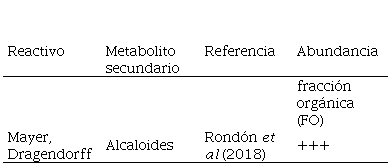 El extracto acuoso, así como la fracción orgánica fueron sometidos a pruebas siguiendo la metodología de Rondón et al. (2018). El propósito del análisis previo fue corroborar de manera primaria la presencia de metabolitos de interés en las muestras. Fue evaluada la abundancia de alcaloides utilizando los reactivos Mayer y Dragendorff, éstos provocan coloraciones específicas y/o precipitados de acuerdo a la presencia de grupos funcionales en los extractos analizados.
