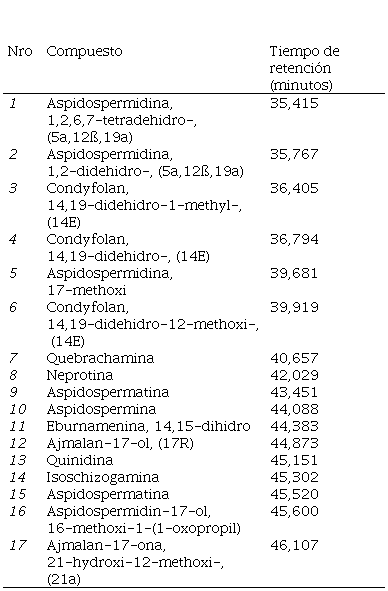 Bajo las condiciones en las cuales se realizaron los experimentos se lograron determinardiecisiete compuestos mayoritarios presentes en la fracción orgánica obtenida a partir del extracto acuoso de la corteza de Aspidosperma quebracho-blanco Schltdl. proveniente del Chaco paraguayo, utilizando cromatografía gaseosa acoplada a espectrometría de masas. Las estructuras químicas de estos constituyentes como sus correspondientes espectros de masas fueron identificados mediante el contraste de éstos con los datos contenidos en la biblioteca de referencia de espectros de masas National Institute of Standards and Technology - NIST con que cuenta el equipo utilizado para los análisis. La Tabla 2 presenta el resumen de moléculas con sus correspondientes tiempos de retención.