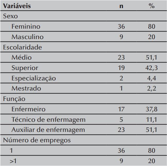 A distribuição dos participantes segundo as variáveis do estudo está apresentada na Tabela 1. Observou-se que dos 45 entrevistados, 36 (80%) era do sexo feminino, 23 (51,1%) possuía ensino médio, 23 (51,1%) eram auxiliares de enfermagem e 17 (37,8%) enfermeiros. Ressalta-se que 36 (80%) participantes possuíam um único emprego.