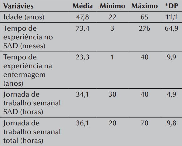 Observa-se na Tabela 2 que a média de idade dos participantes foi de 47,8 anos, o mínimo de tempo de trabalho no SAD foi de três meses, a média do tempo de experiência na enfermagem foi de 23,3 anos, o máximo de jornada no SAD foi de 40 horas semanais e de jornada total foi de 70 horas semanais.