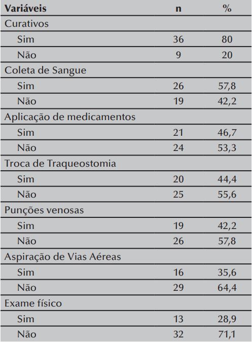 Os profissionais de enfermagem que atuam no SAD foram questionados a respeito de quais procedimentos eles utilizam EPI, durante sua prática profissional no domicílio, podendo relatar mais de um procedimento. Observou-se que o uso de EPI foi mais frequentemente relatado durante a realização de curativos 36 (80%), e nos procedimentos considerados de alto risco, como punções venosas e aspiração de vias aéreas, houve menor adesão ao uso dos EPI (Tabela 3).