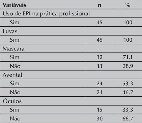 Verificou-se que todos os profissionais entrevistados relataram usar EPI, porém apenas as luvas foram citadas por 45 (100%) deles e o menos utilizado segundo o relato dos profissionais e foi o óculos de proteção 15 (33,3%) (Tabela 4).