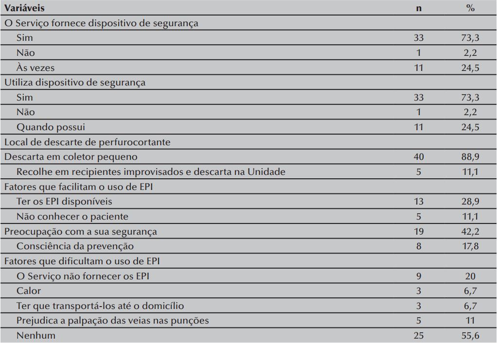 Um fator que pode conferir maior segurança aos profissionais que atuam nos domicílios é a utilização de dispositivos de segurança (lancetas, agulhas retráteis, entre outros) como recomendados pela NR-32(4). Estudo conduzido com enfermeiros que atuavam na assistência domiciliar mostrou que não utilizavam tais dispositivos devido à dificuldade ao acesso e também por não serem fornecidos por suas agências(19). Porém, o fornecimento do EPI e dos dispositivos de segurança não é garantia de que os profissionais tenham adesão ao seu uso ou os utilizem conforme recomendado.