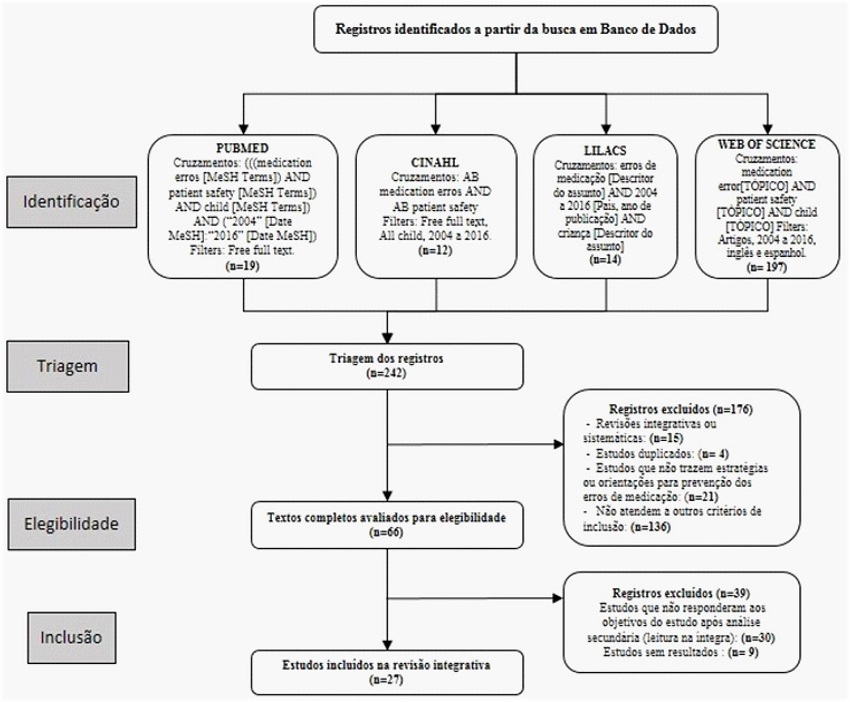 Os critérios de exclusão foram: estudos de revisão, livros, teses e dissertações; estudos gerais sobre segurança do paciente; e estudos que não abordassem estratégias para prevenção de erros de medicação em pediatria.O fluxograma dos cruzamentos de descritores e resultados das buscas é apresentado na Figura 1 e seguiu as recomendações Prisma(8).