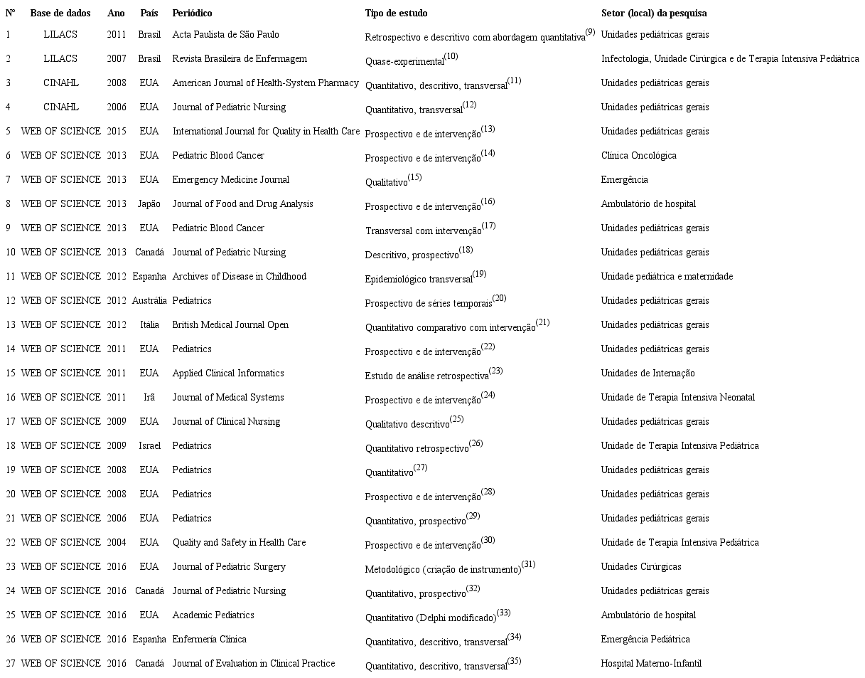 Dois estudos foram realizados no Brasil(9-10). A maioria das pesquisas sobre o tema proposto foi realizada no exterior, com destaque para Estados Unidos da América(11-15,17,22-23,25,27-31,33). Com relação ao ano de publicação, há predomínio a partir do ano de 2011(9,13-24,31-35). Unidades pediátricas gerais aparecem como maior foco dos estudos (66,6%), entre elas, unidades de internação clínica e unidades cirúrgicas(9,11-13,17-23,25,27-29,31-32,35). A Unidade de Terapia Intensiva (UTI) foi o setor isolado mais estudado (18,5%)(2,10,24,26,30).