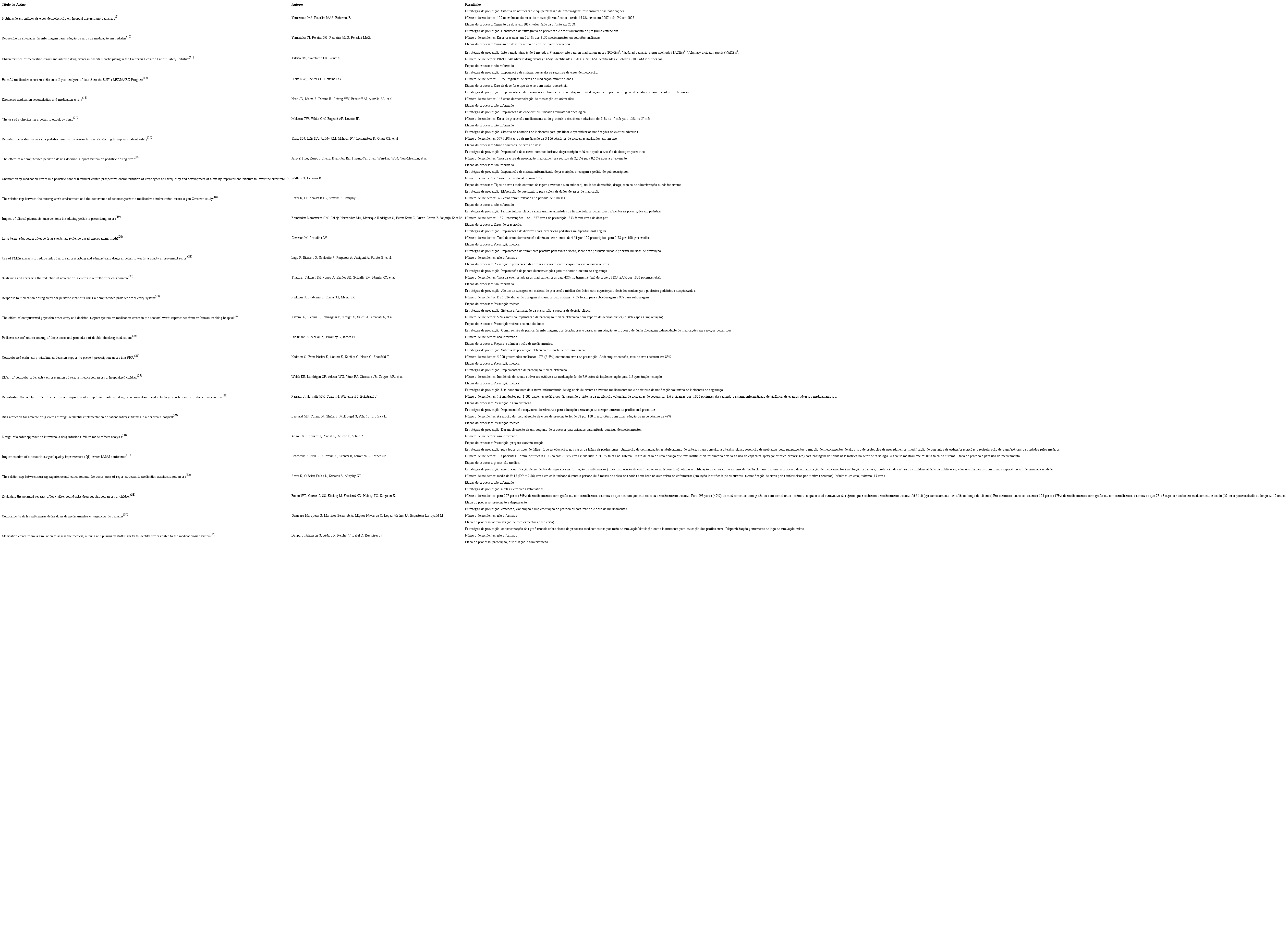 Dos estudos que propuseram intervenções, observou-se que poucos seguiram uma proposta metodológica clássica com análise estatística. Estudos quantitativos, prospectivos e com intervenção(13-14,16,18,20-22,24,28-30,32) foram (48,1%). O periódico Pediatrics destacou-se por ter quatro publicações abordando a temática prevenção de erros de medicação em pediatria(20,22,26-29). No Quadro 2 são apresentados os resultados que respondem ao objetivo desse estudo.