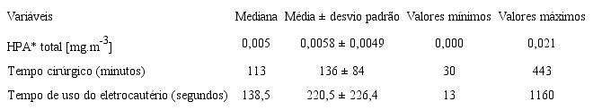Na Tabela 1, apresentam-se as estatísticas descritivas das concentrações dos HPA, tempo total cirúrgico e tempo de uso do eletrocautério.