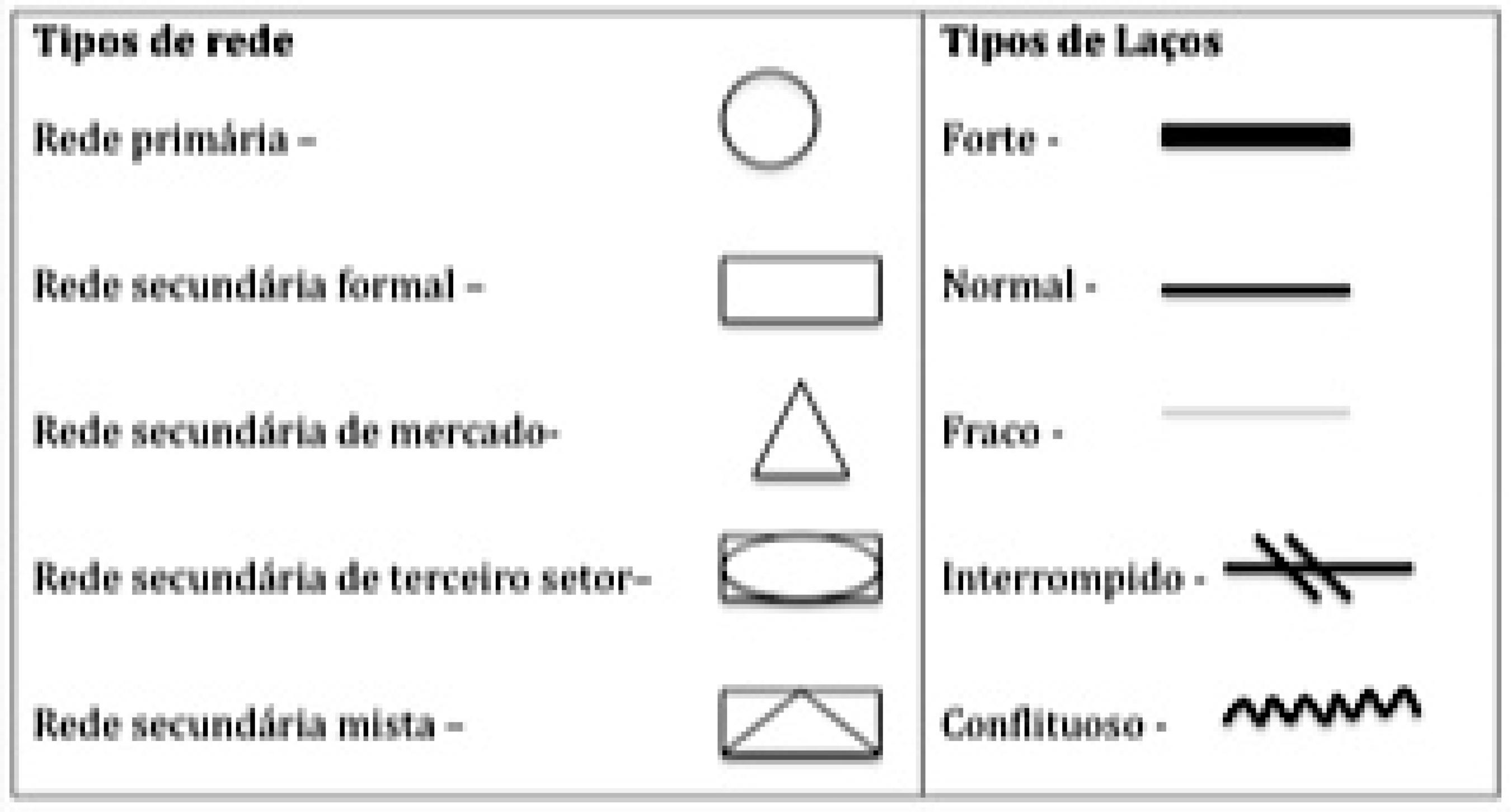 Para a confecção do mapa da rede social, foi imprescindível a utilização de símbolos sob a forma de figuras geométricas (representam os tipos de rede social) e de traçados gráficos (indicam os tipos de laços)(2), conforme observa-se na Figura 1.