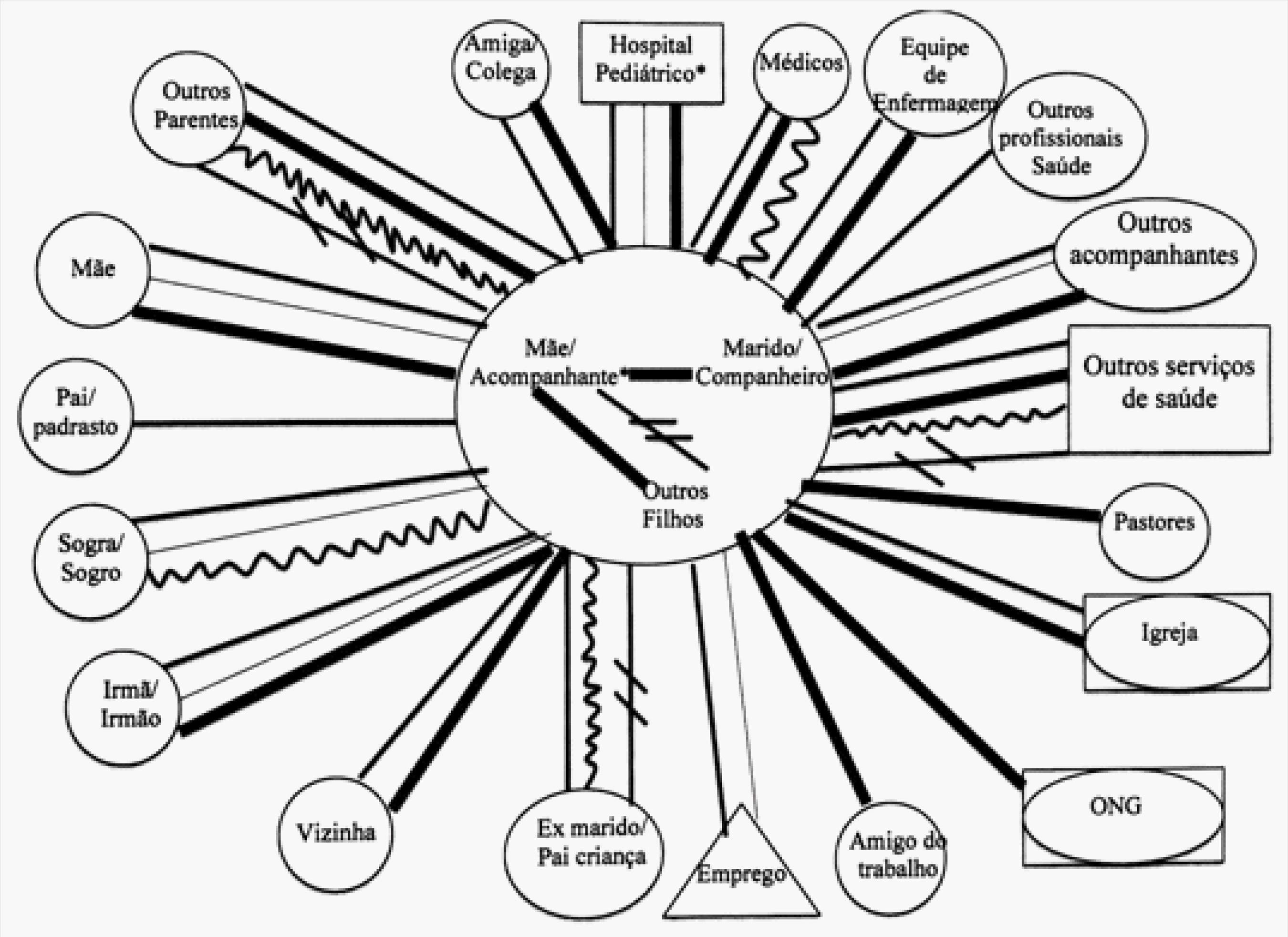 Para compor o mapa com a síntese, foram consideradas todas as relações sociais construídas nos mapas individuais de cada mãe/acompanhante, tendo em vista que as redes primárias e secundárias foram compostas pelos membros da família com o mesmo grau de parentesco, bem como outras pessoas e instituições. No entanto, no que se refere aos laços estabelecidos, estes se mostraram: normal, forte, conflituoso e rompido, por isso, apresenta-se na figura mais de um traço.