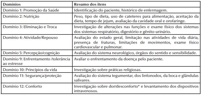 Os domínios da NANDA-I: Domínio 1- Promoção à saúde, Domínio 6- Autopercepção, Domínio 7- Papeis e relacionamentos, Domínio 8- Sexualidade e Domínio 13- Crescimento/desenvolvimento não foram identificados durante a caracterização e a revisão na literatura como atribuíveis a este perfil de pacientes. Dessa forma, não foram incorporados ao instrumento, uma vez que para esses pacientes são priorizados cuidados que visem a manutenção da vida, recuperação da saúde e redução de sequelas(10-18,24).