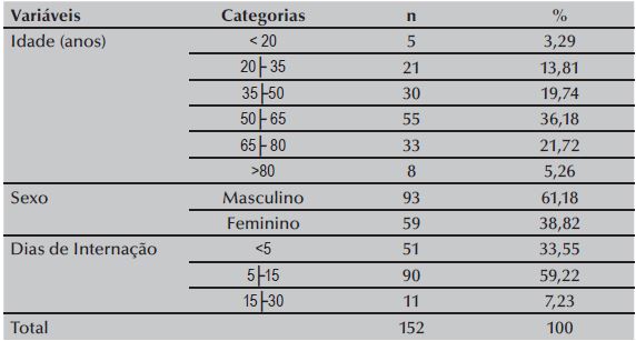 Durante a coleta de dados, 152 pacientes estiveram internados nas UTIs, com idade média de 54,90 anos e desvio padrão de 16,83 anos; o tempo médio de internação de 8,05 dias e desvio padrão de 5,24. Outros dados do perfil dos pacientes internados no período de coleta de dados são mostrados na Tabela 1.