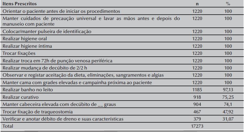 Na Tabela 3, listam-se os itens contidos na Prescrição de Enfermagem elaboradas pelos enfermeiros das UTIs.