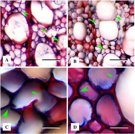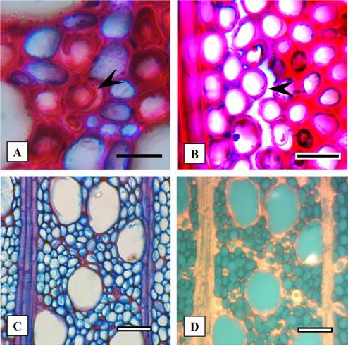 Samples exposed to the fungi for 120 days were cut into small cubes (5×5×5 mm) and then sectioned with a sledge microtome (~ 10 µm). Since the moisture content of specimens was high and the tissue was soft, sectioning was carried out right after incubation, without any pretreatments. To distinguish the cell wall and hyphae, sections were double-stained with safranin O (0,5%) and Astrablue (0,3%) dissolved in distilled water followed by conventional microscopy including dehydration and mounting on microscopic slides (Gartner and Schweingruber 2013, Bari et al. 2015c). The prepared slides were studied by BEL epifluorescence microscopy under bright field and ultraviolet light (330-400nm). Under bright field light, lignified cell walls appear red while hyphal walls and delignified xylem cells get blue color. UV fluorescence microscope, on the other hand, was used to qualitatively trace lignified versus delignified cells of xylem.