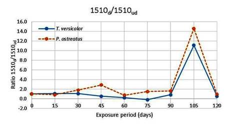 Ratios of peak intensity at 1510 cm-1 (C=C stretching in lignin aromatic skeletal structure) is presented in Figure 10 for both test fungi. The trends of the ratios vary similarly for both fungi during the exposure period with an increase at day 105. This increase indicates that the C=C band intensities in the decayed wood are higher than the un-decayed wood due to fungal attack, indicating that the lignin structure has been severely attacked by the test fungi at day 105 (Figure 4 and Figure 8).