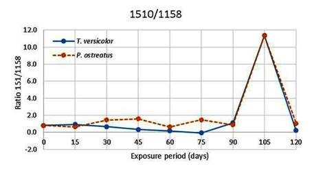 The ratio of peaks at 1510/1158 cm-1 (C=C stretching in lignin and C-O-C stretching in cellulose, respectively) is shown in Figure 11. The ratios varied for both test fungi with an increase at day 105 of fungal exposure. The increase shows that the C=C band intensities are higher than that of C-O-C at day 105, indicating that severe attack of the lignin has been occurred compared to attack of the cellulose.
