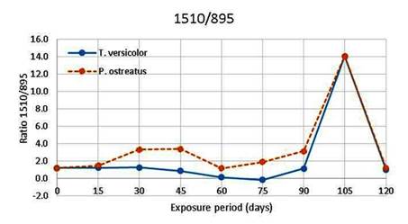 The ratio of peaks of the wave numbers 1510/895 cm-1 is shown in Figure 12. The peak at wave number 895 cm-1 is assigned for =C-H out of plane stretching which is related to lignin structure. There are similarities for both test fungi during exposure, with an increase occurring at day 105. However, there are some different fluctuations in the peak ratio for P. ostreatus. This indicates that both fungi attack the wood with similar patterns; however, they sometimes use different strategies to attack lignin. Any increase in peak ratio indicates that lignin has been broken down, many bonds are cleaved, and new bonds appeared in the lignin structure. In this case, an increase of =C-H bonds expressed as C=C bonds which have already been cleaved in lignin, or the intermolecular bonds in lignin monomers have already been broken down during fungal attack. The results presented here as well as the microscopic observations confirm the above mentioned results; especially Figure 4 and Figure 8. In general, it can be seen that the lignin has been severely attacked util2 day 105 and the liberated materials have been assimilated before day 120. Because there are quite similarities between days 120 and 0.