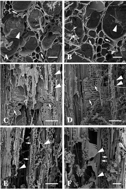 The series of micrographs of decayed woods in Figure 2 showed that the decay patterns caused by the two test fungi are very similar. In addition, the diagnostic features of decay represent simultaneous white-rot for both fungi. The arrows denote fiber cell walls which have thinned due to fungal attack, indicating that all cell wall polymers are degraded by the fungi. This means that not only both fungi are capable of degrading lignin and hemicelluloses, but also they can attack cellulose polymer as well. The decomposition of S2 and S3 layers and the remainder of only a thin middle lamella (Figure 1, Figure 3A and Figure 3B) are the result of the fungi using all of the cell wall components, which has previously been reported (Liese 1970, Wilcox 1973, Schwarze et al. 2004, Schmidt 2006, Schwarze 2007, Kubicek 2013). When decay develops throughout the xylem, previously tiny bore holes on the cell wall coalesce together and become ruptures in the cell walls (Figure 1C and Figure 1D; arrowheads). Erosion along with the reducing of the fiber's wall thickness are further evidences of similar patterns of decay by studied fungi. In simultaneous white-rot decay patterns, the decay occurs in vicinity of the hyphae, with subsequent formation of erosion troughs where the hyphae are growing on the cell walls (Wilcox 1973, Anagnost 1998, Schwarze et al. 2004, Schwarze 2007, Kubicek 2013, Bari et al. 2015c, Kim et al. 2015). In the case of samples decayed with Pleurotus ostreatus, the process and features of decay are similar for most components of the wood. However, in very confined areas of one sample, anatomical diagnosis of selective white-rot decay was also observed, e.g. separation of the cells, while the secondary walls remained almost intact (Figure 2). Complete decomposition of ray parenchyma cells (arrows) as well as degradation of the cell walls and vessels (arrowheads) occurred due to severe degradation of cell wall components (Figure 3C, Figure 3D). Separation of the ray cell walls along with vessel lumina (arrows) and serious decomposition of woody structure (arrowheads) took place causing massive consumption of cell wall components (Figure 3E and Figure 3F). It has been reported that some white-rot fungi are capable of optimizing their decomposition strategy by changing from simultaneous to selective decay or selectively digest lignin in one place of the sample and show symptoms of simultaneous decay at the other place of the same sample (Hartig 1878, Nagadesi et al. 2013, Bari et al. 2015c). The switching in fungal behaviors, therefore, may causes changes in lingo-cellulolytic enzyme activity during the degradation of woody materials (Sunardi et al. 2016).