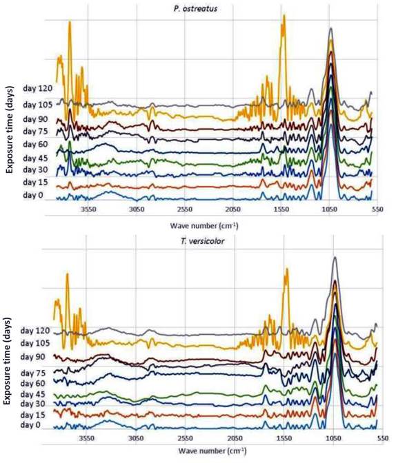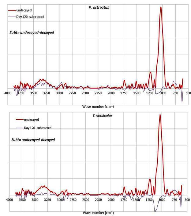 The new peaks disappeared for days 15, 75 and 120 (Figure 7, Figure 8, Figure 9). It is interesting to see considerable differences in spectra for decayed wood at days 105 and 120 (Figure 8, Figure 9). The new peaks appeared in wood exposed to the test fungi for 105 days (Figure 8) and disappeared at 120 days (Figure 9), indicating that both fungi degraded cell wall constituents until day 105 and then liberated them as small molecules. Afterwards, those molecules were assimilated as carbon sources by the fungi (Figure 9). Subsequently, fragments or non-degraded parts of the cell walls remained which are chemically similar to un-decayed wood. As shown in Figure 9, there are no substantial differences between spectra for decayed and un-decayed wood at this phase.