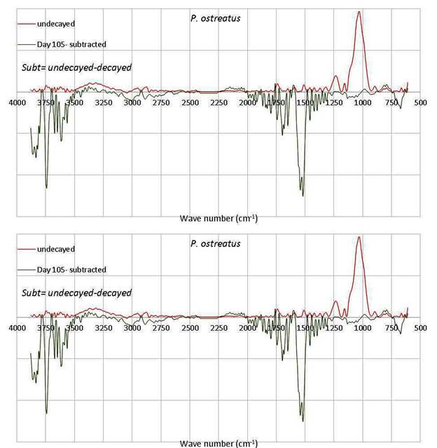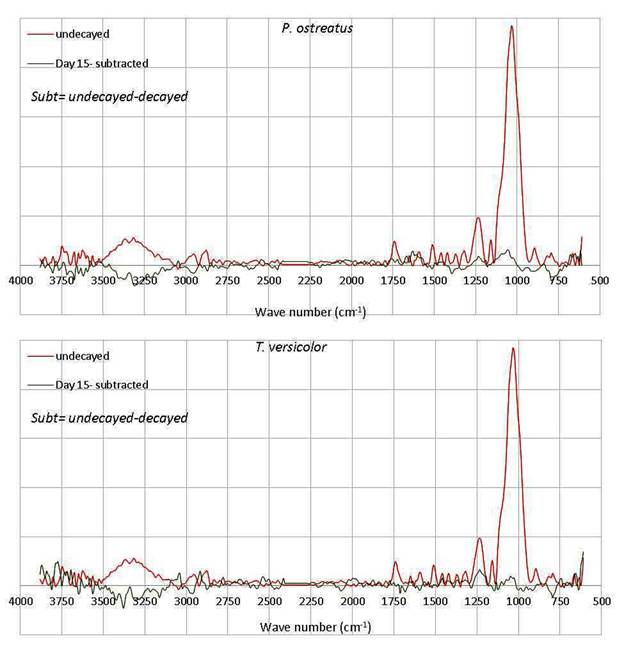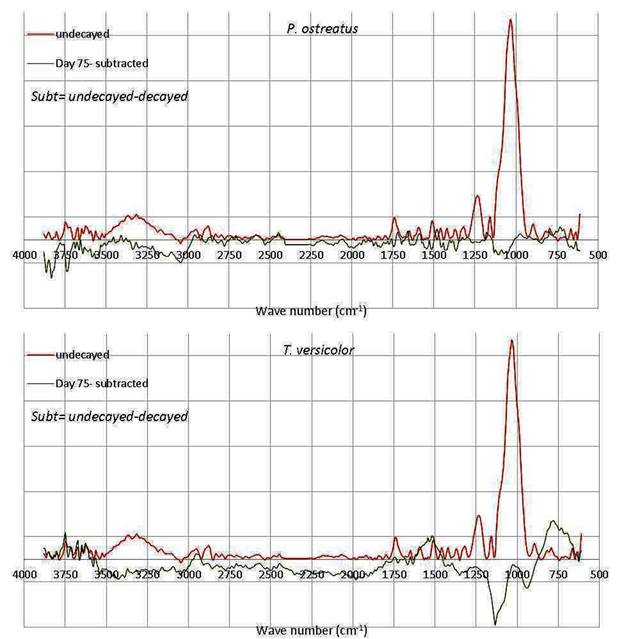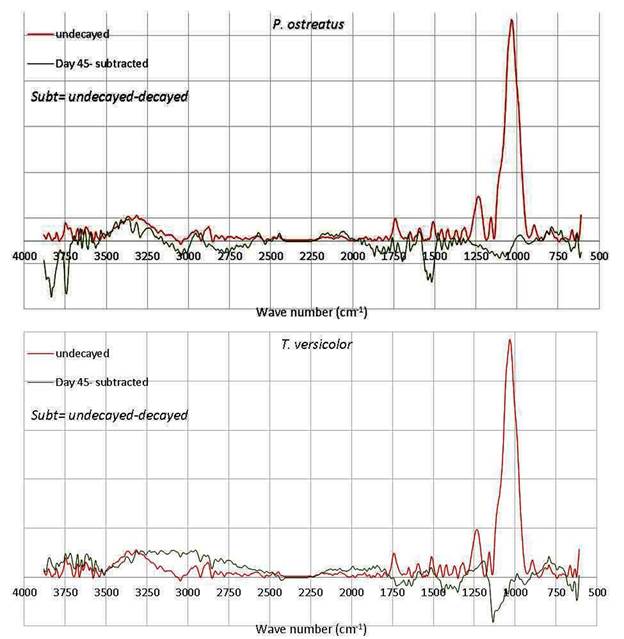 Subtraction of the un-decayed peaks clearly shows the presence of newly formed peaks for the decayed wood (Figure 5, Figure 6, Figure 7, Figure 8, Figure 9). In Figure 5, Figure 6, Figure 7, Figure 8, Figure 9, the baselines (line zero) indicates changes in the decayed wood in comparison to the un-decayed wood. The subtracted peaks above the baseline showed a decrease in intensity of the present peaks and the peaks below the baseline indicate an increase of the present peaks as well as appearance of new bands due to fungal attack. When there is no difference between the peaks, the subtracted peak intensities are zero. In this situation, the subtracted peaks are located on baselines which indicate no changes in the wood during fungal attack. The spectra for the wood decayed by both fungi during the early stages of exposure revealed fewer alterations in wood chemistry which is probably due to reduced decay; while the wood attacked for 45 days revealed the appearance of new peaks (1800-400cm-1); especially for hemicelluloses and lignin (Figure 6).