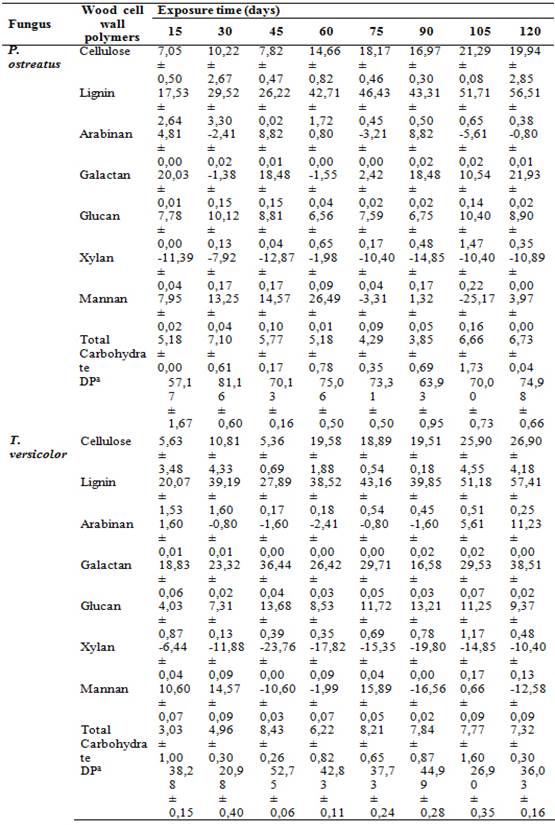 The data in Table 2, shows that the average percent losses in hemicelluloses (total carbohydrate) at the end of the incubation were 6,73% and 7,32% for Pleurotus ostreatus and Trametes versicolor, respectively. Glucan, galactan, and arabinan were the most noticeable hemicellulose components depleted by both fungi. In contrast to cellulose, the structure of hemicelluloses contains heteropolysaccharides constituents (Sjöström 1993, Kubicek 2013). One of the functions of hemicelluloses is protecting the cellulose microfibrils by providing physical barriers against hydrolytic enzymes. Hence, removal of the hemicellulose components from the cellulose microfibrils facilitates access of fungal hydrolytic enzymes to cellulose (Yang and Wyman 2004). Since the arabinan and galactan are side chain elements of xylan and mannan; they are very susceptible to degradation (Timell 1967). It has been suggested that they may be attacked before the main chain of the polymer (Curling et al. 2002). Therefore, the full decomposition of hemicelluloses requires the activation of special enzymes such as endo-β-(1,4)-xylanase and β-xylosidase (Eriksson et al. 1990, Kubicek 2013). Overall, hemicelluloses were the most degraded polymers in beech wood exposed to both fungi as shown in Table 2. Determination of the total carbohydrate showed similar reduction for beech exposed to both fungi as well as their ability to produce specialized enzymes for the decomposition of wood cell walls.