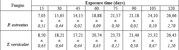 The average mass loss of the wood samples at different periods of exposure to the white rot fungi, P.ostreatus and T.versicolor, are presented in Table 1. The data shows that both fungi attacked beech wood with similar decay capabilities resulting in an almost identical amount of mass loss. Both fungi decreased the wood mass about 15-18% at 30 days exposure and 26% after 120 days exposure. Both fungi exhibited similar capabilities to severely attack the wood within the first month (Table 1). Similar results were also previously reported by authors (Bravery 1978 and Bari et al. 2015d). Minor fluctuations in mass loss among blocks were also similar for both fungi.