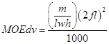 Using the specimen’s mass (m, in kg), width (w, in m), length (l, in m), height (h in m), and the longitudinal vibration frequency (f, in Hz), MOEdv (in N/mm2) is calculated with the following equation (Equation 1):