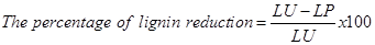 The reduction in lignin was calculated based on the initial dry weight of the lignin in the both chip and bleached kraft pulp (LU) and the dry weight of the lignin in the remaining solids after the pulping, bleaching, refining, enzymatic hydrolysis and homogenizing treatments (LP). The percentage of lignin reduction was calculated with the following Equation 1: