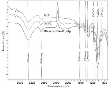The intensity of the peaks was highest for the bleached kraft pulp compared to MFC and NFC. Results showed that pretreatments to produce MFC and NFC caused some structural deformations in glucose units (Duchesne et al. 2001, Newman 2004).