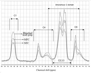C2, C3 and C5 peaks were observed at around 61-53 ppm. Results showed that pretreatments had no significant effect and the peaks of bleached kraft pulp, MFC and NFC were almost identical.