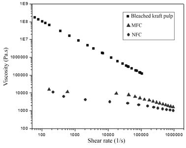 The rheological properties of bio-based suspensions are of vital importance for the prediction of composites performance for the potential end applications. The viscosity was plotted as a function of the shear rate for bleached kraft pulp, MFC and NFC samples (Figure 3). The produced NFC had the lowest viscosity.