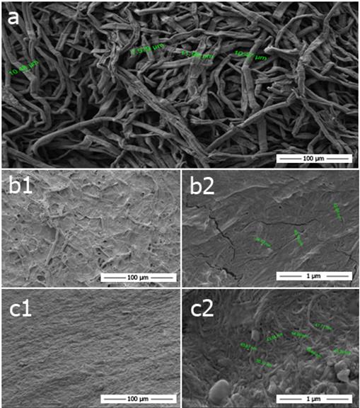 The morphological properties of the samples were analyzed by taking SEM (FEI Quanta FEG 250, FEI Corp.) images. The samples were first dried at 105 °C overnight, and then coated up to 5 nm with a gold-palladium composite. Pictures were taken for all samples at 1-15 kV using a field emission gun equipped with a compacted secondary electron detector. Scales were selected as 100 µm for fiber materials and 1 and 100 µm for MFC and NFC. In addition, SEM analyses were carried out for MFC or NFC films.