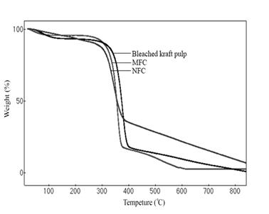 A significant weight loss was observed at about 320 ºC-400 ºC. The NFC showed the lowest thermal decomposition and thermal stability (318 ºC) as well as broader degradation range compared to bleached kraft pulp (340 ºC) and MFC (328 ºC).