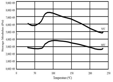 Figure 6 showed that the storage modulus of the NFC and MFC films for the temperature of 30°C were observed to be 6,04 GPa and 2,82 GPa respectively. The maximum storage modulus values for NFC and MFC were 7,68 GPa and 3,82 GPa respectively.