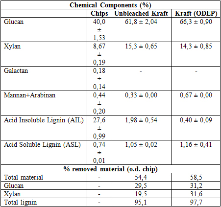 The chemical composition of wood and un/bleached pulps were shown in Table 2. The chemical compositions of wood determined in this study were comparable with the findings of Moussaouiti et al. (2012). The lignin, glucan and xylan solubilizations were found to be 97,7%; 31,2% and 31,6% (o.d. chip) for the bleached pulp, respectively. The proportional increase in glucan content for both un/bleached kraft pulps was explained by the lignin delignification. The kraft pulp had 15,3% xylan and bleaching slightly decreased the xylan content. Removal of xylan with lignin could be due to the lignin carbohydrate complexes (LCC).